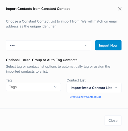 - Click this button to pop open an import window that will list the current mailing lists in your email marketing platform