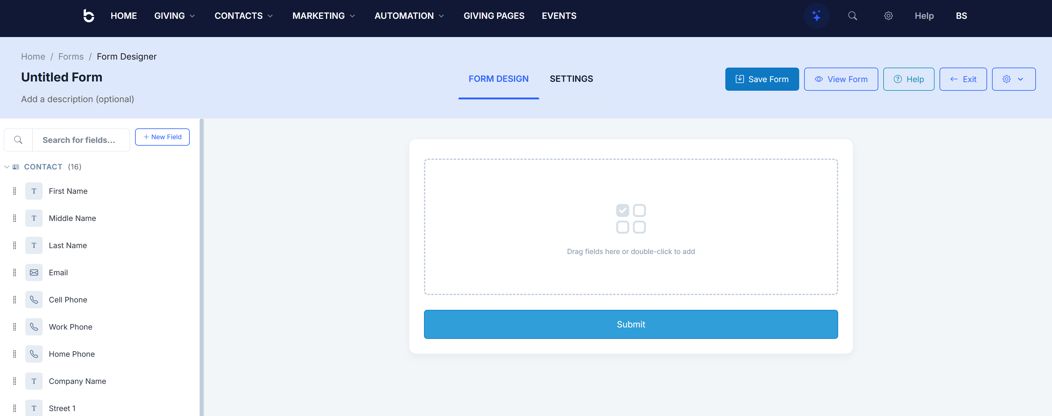 - Form canvas — The center area where you build your form. Drag fields here or double-click them from the sidebar to add them. A "Submit" button is included automatically at the bottom.