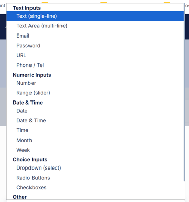 | Text Inputs | Text (single-line), Text Area (multi-line), Email, Password, URL, Phone / Tel |