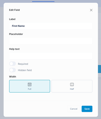 - Width — Choose between Full (the field spans the entire row) or Half (two fields can sit side by side).