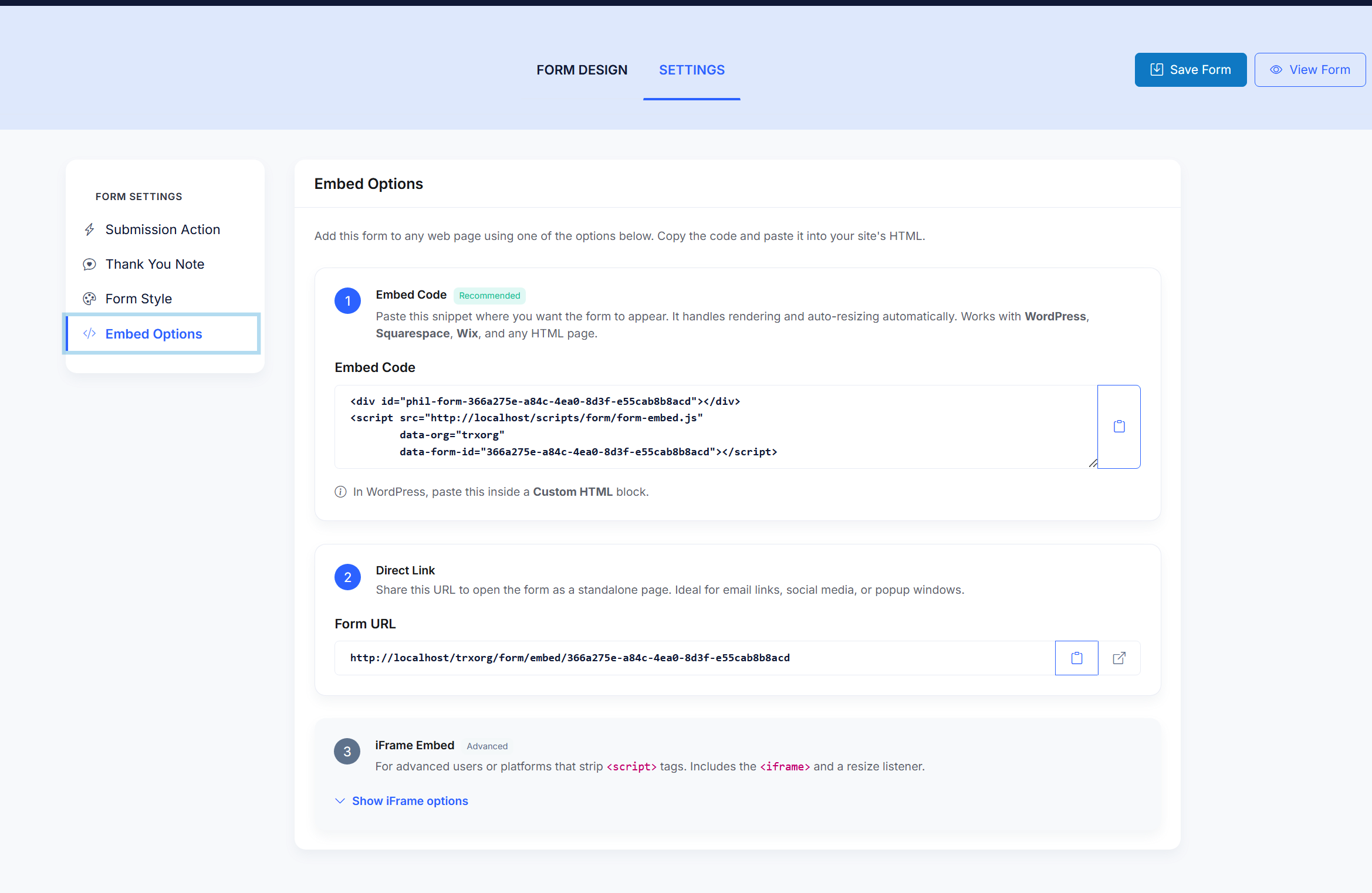 Once your form is designed and saved, you can share it with the world. BetterUnite gives you three ways to put your form in front of people: an embed code snippet, a direct link, and an iframe embed for advanced use cases.