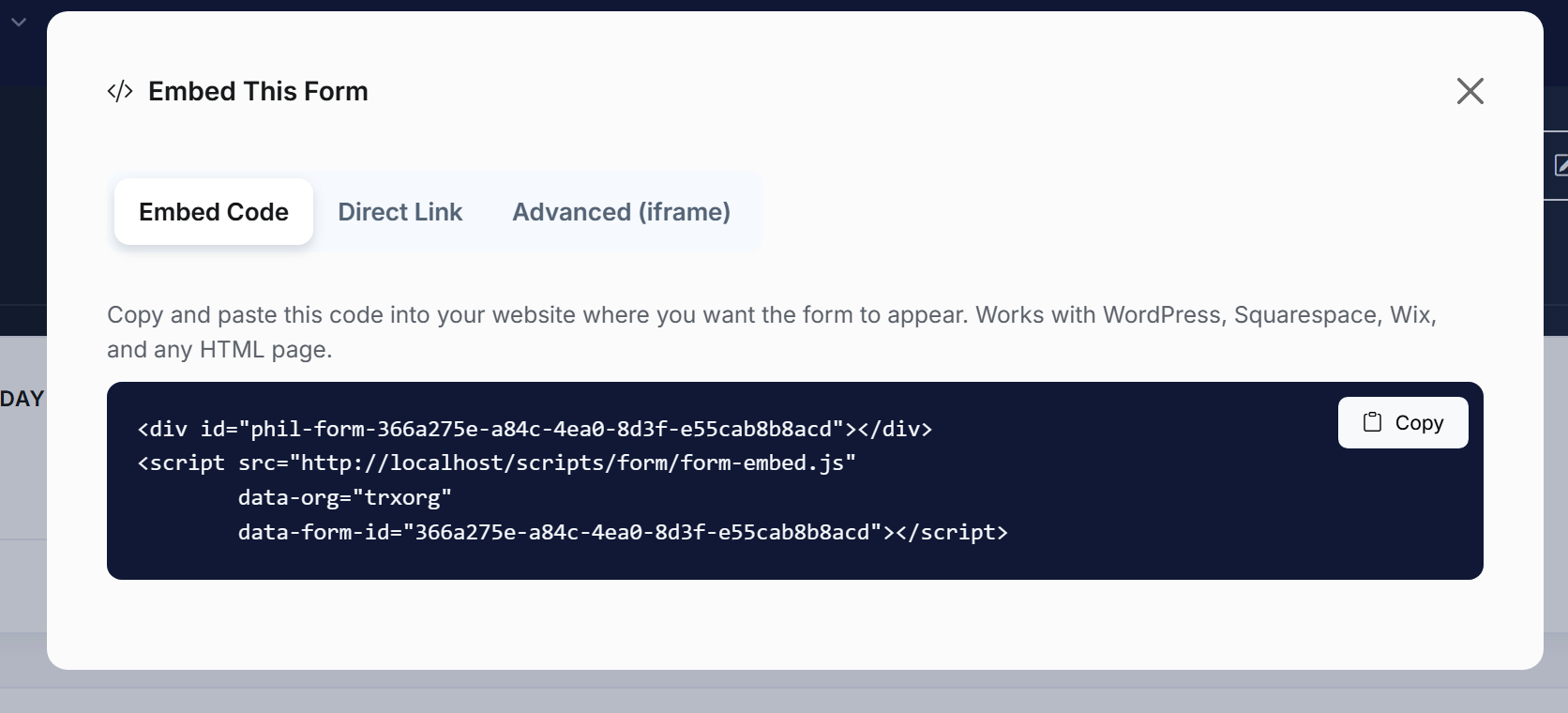 If you want to share your form as a standalone page — for example, in an email, on social media, or as a popup link — use the Direct Link.