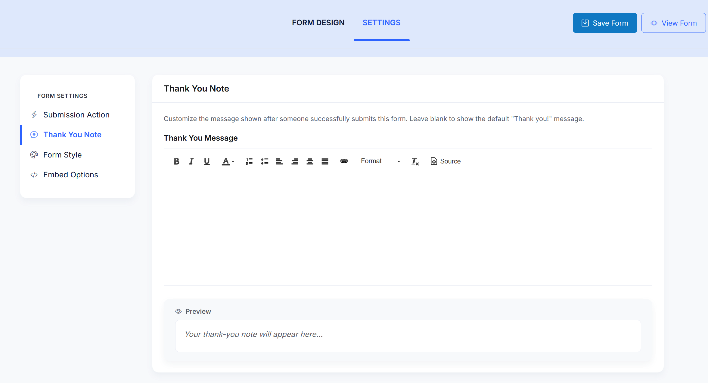 The Thank You Note is the message displayed to the person after they successfully submit your form. By default, a simple "Thank you!" message is shown, but you can customize it to say anything you'd like.