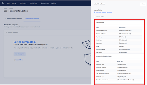 - When creating and editing letters, you can enhance personalization and efficiency by utilizing the merge text fields. These fields enable you to dynamically insert relevant donor or transaction details into your letter.