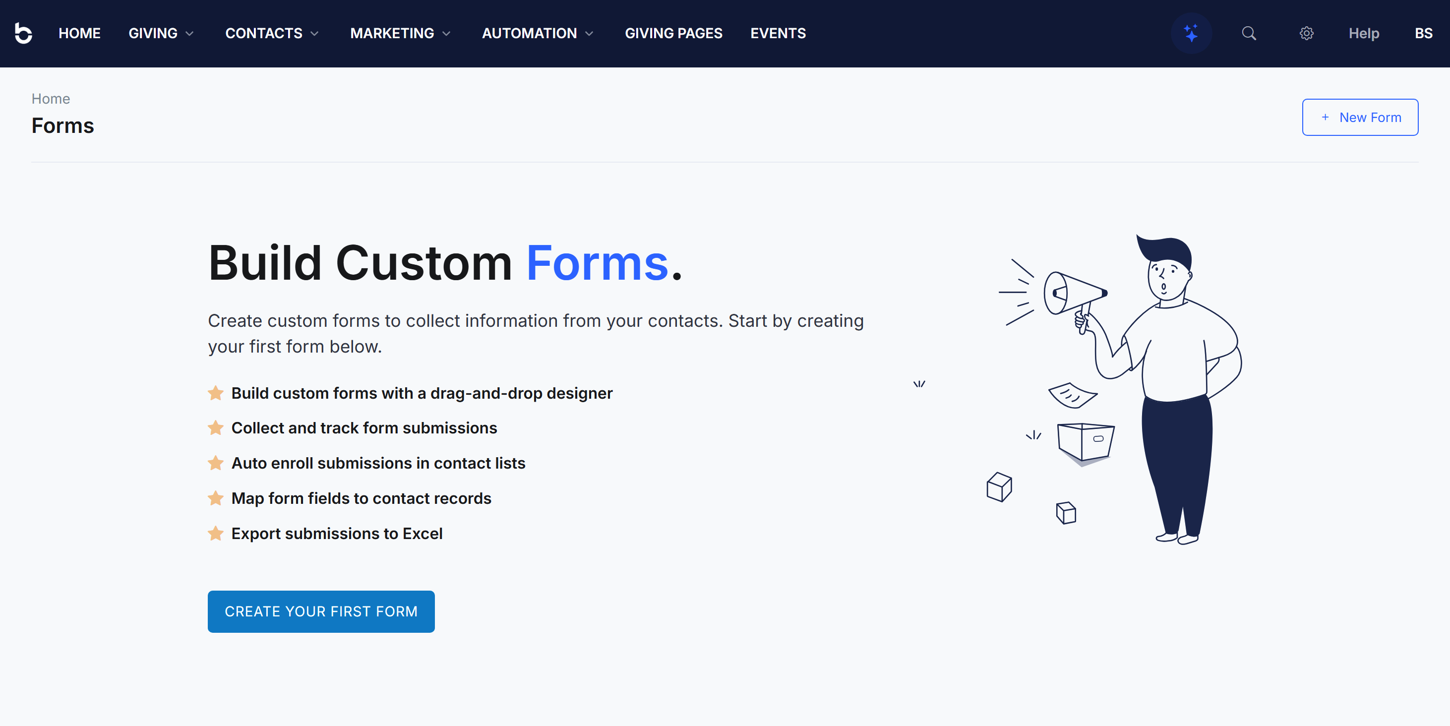 To get to the Forms section, navigate to Marketing > Custom Forms from the top navigation bar. If you haven't created any forms yet, you'll see a welcome screen inviting you to create your first one.