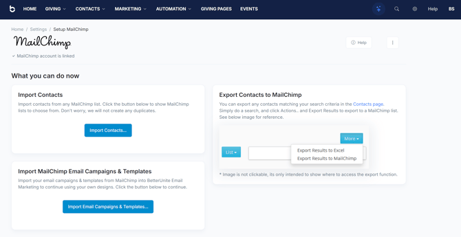 The email marketing tools are all two-way integrations, meaning that contacts that you have in them can be brought into your BetterUnite system and contacts you have in BetterUnite can be exported to existing or new mailing lists in your email marketing tool.