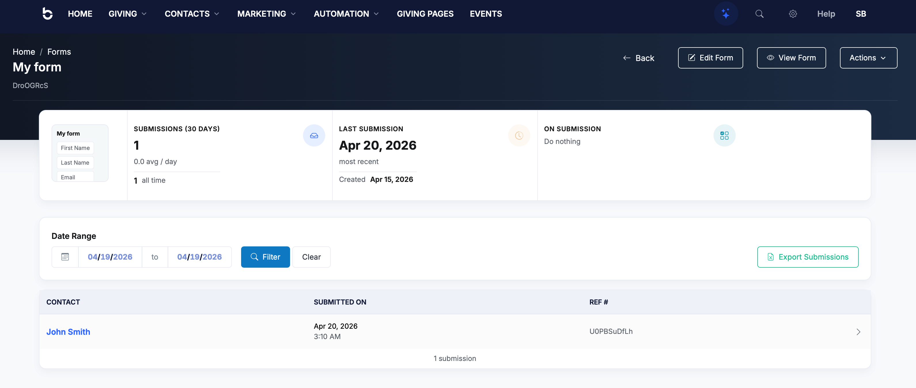Form submissions are also linked to the contact's record, so you can see a person's form activity without leaving their profile.