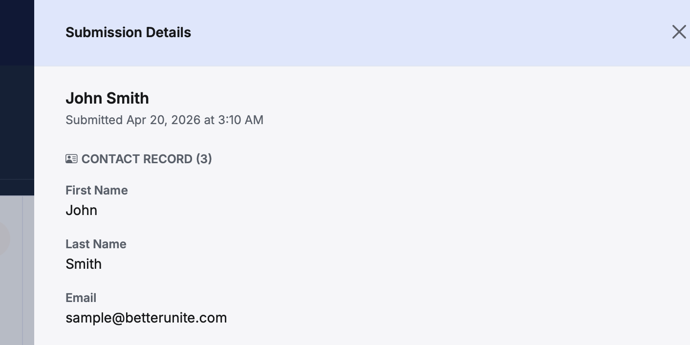 - Contact — The name of the person who submitted the form. Each name is a clickable link that takes you directly to that contact's record in BetterUnite. An external link icon appears next to the name for quick access.
