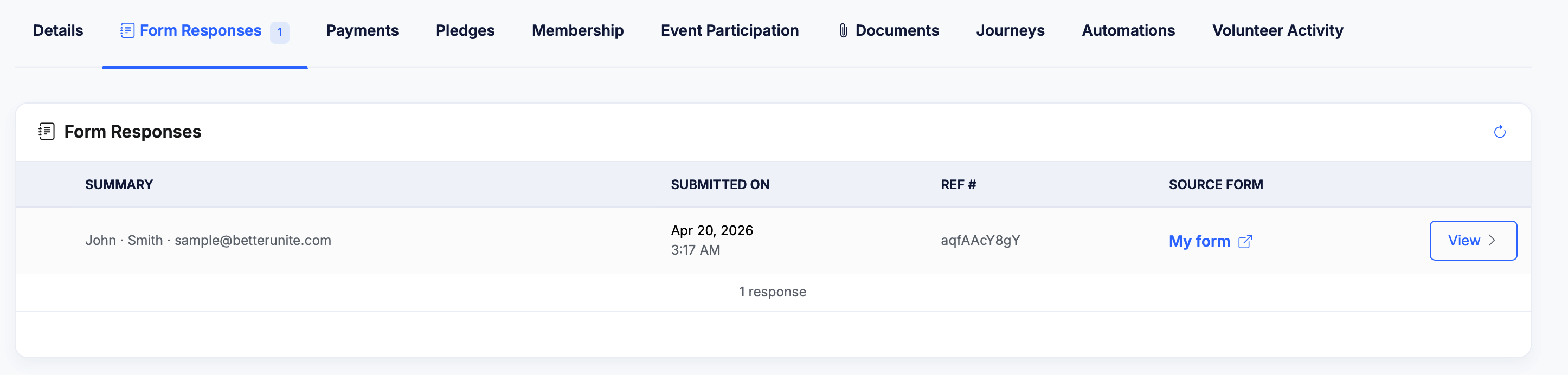 - You'll see a table listing each form response with the Summary (submitted field values), Submitted On date, Ref # (a unique reference ID), and Source Form (which form the response came from, with a link to that form).