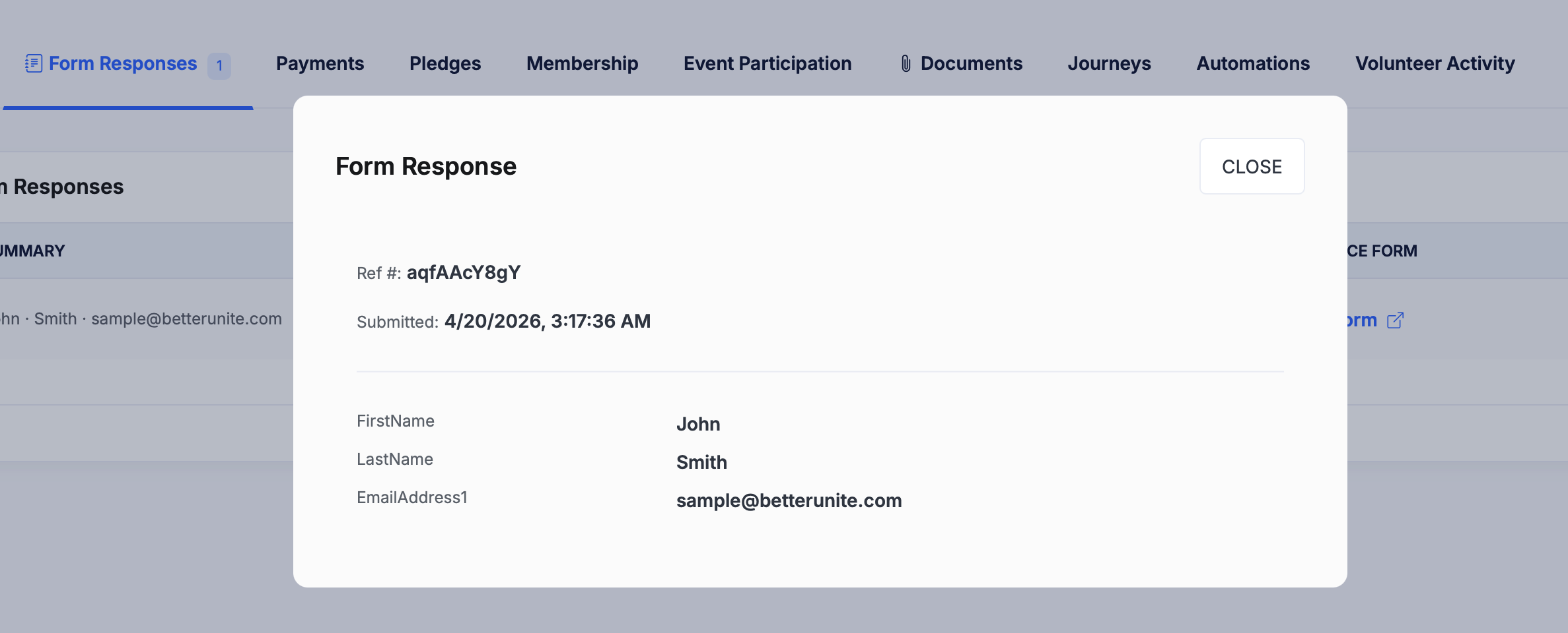 - Click the Form Responses tab in the contact record's tab bar. A badge shows the number of form responses on file.