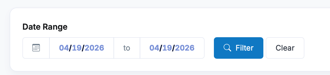 - In the Date Range section, enter a start date in the first field and an end date in the second field (mm/dd/yyyy format), or use the calendar picker.