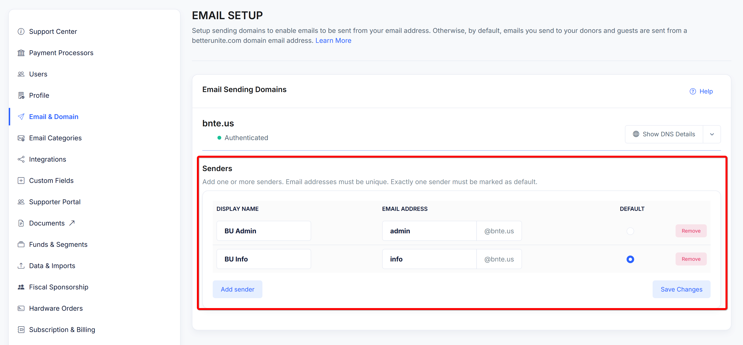 All senders operate under the same verified domain, keeping setup fast and secure.