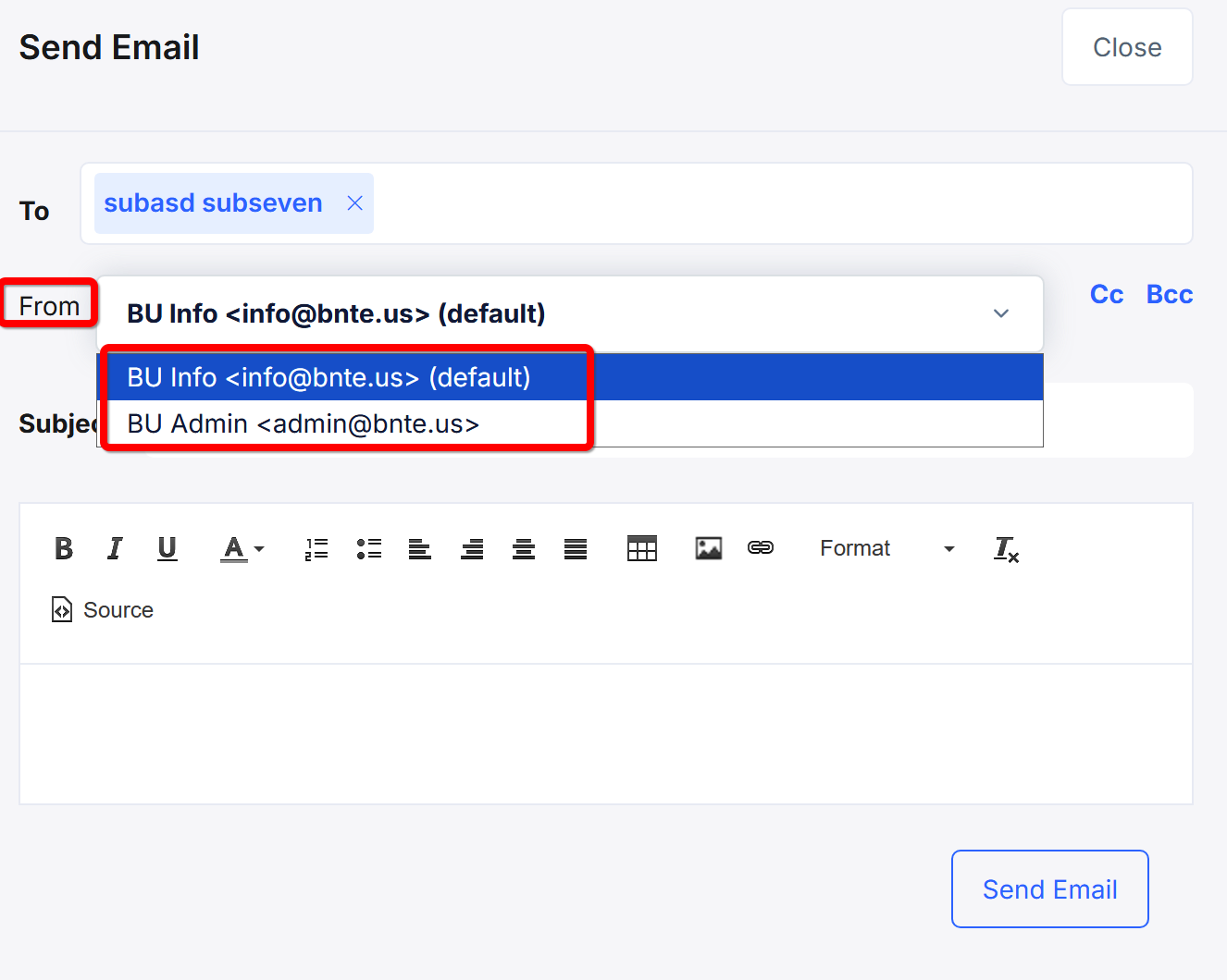 We’ve added new functionality that gives you more control and flexibility over the “From” address used when sending emails. You can now configure multiple sending email addresses under a single verified sending domain and choose between them when composing an email.