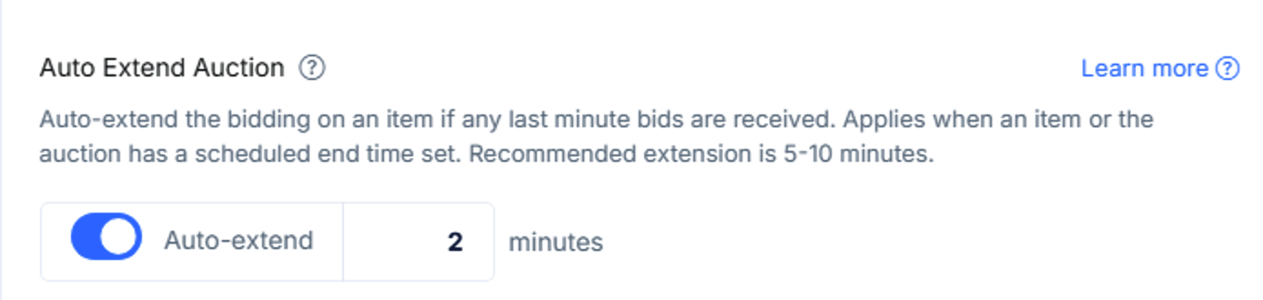 A: You can toggle off auto-extend; future bids won’t extend, but already extended times remain.